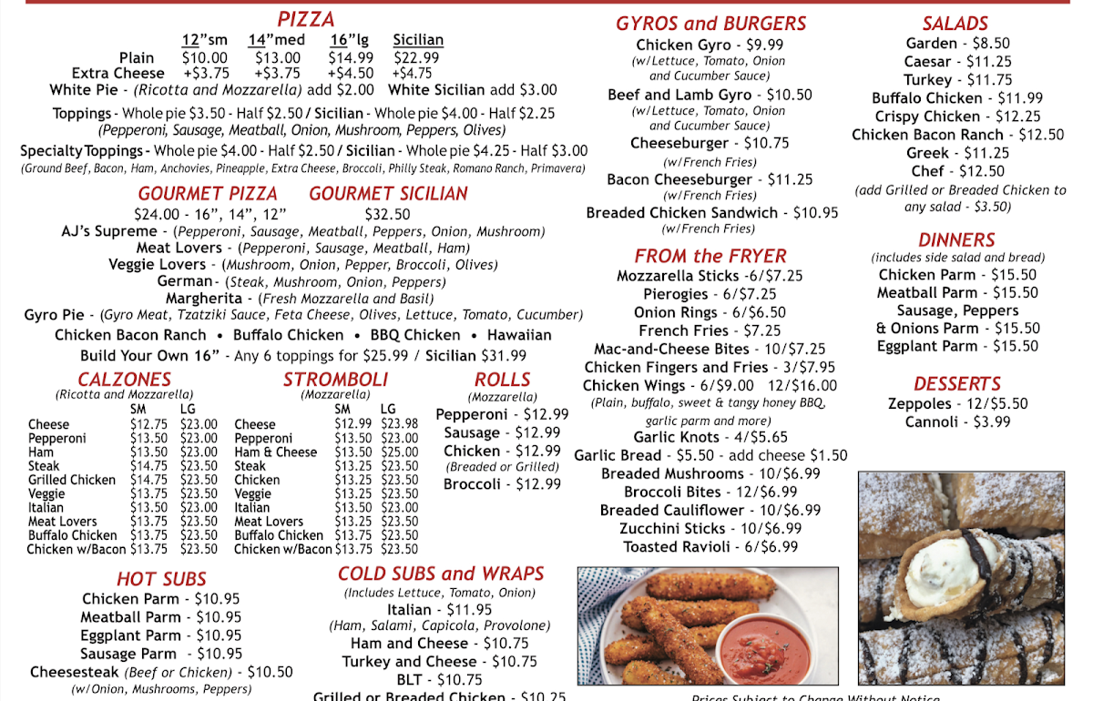 Welcome to Aj Pizza and Parm House, a delightful culinary destination in Pocono Summit, PA. Here, you can indulge in a diverse menu that boasts offerings for every palate. Start your meal with fresh salads, including the flavorful Buffalo Chicken Salad and classic Caesar Salad, perfect for a light and refreshing option.